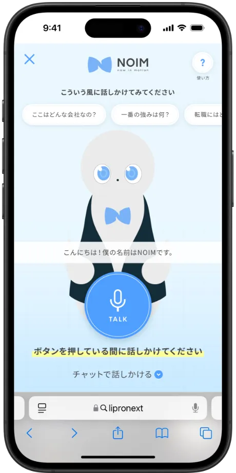 会社紹介・仕事内容・制度の質問にNOIMが会話で対応。求職者が好きな時間に気軽に理解を深められます。